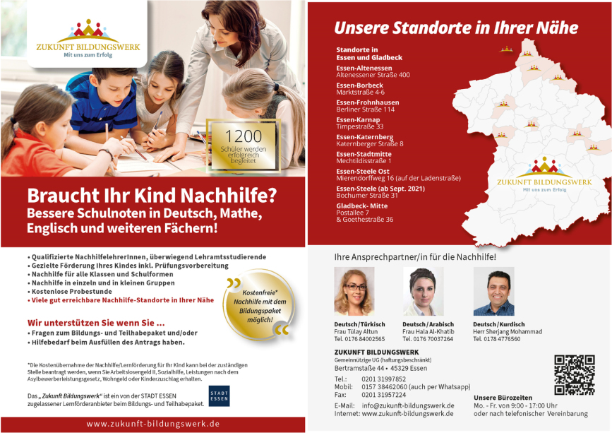 Wir, das gemeinnützige Zukunft Bildungswerk, sind Bildungspartner an vielen Schulen und bieten zusätzlich in unseren eigenen Einrichtungen eine kostenfreie Nachhilfe über das Bildungspaket an. Von unserer Nachhilfe profitieren zurzeit ca. 2000 SchülerInnen im Raum Essen und Umgebung. Wir sind zugelassener Anbieter in Essen, Gladbeck, Mülheim, Duisburg, Bochum und Oberhausen.