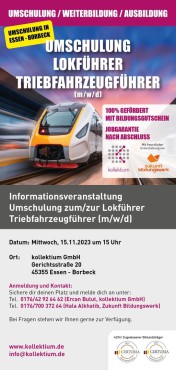 Erfahre alles Wichtige über die Umschulung zum Lokführer: von den Ausbildungsinhalten bis hin zu den beruflichen Perspektiven. Unsere Experten stehen bereit, um dir alle Fragen zu beantworten und dir einen Einblick in diesen zukunftsweisenden Beruf zu gewähren.