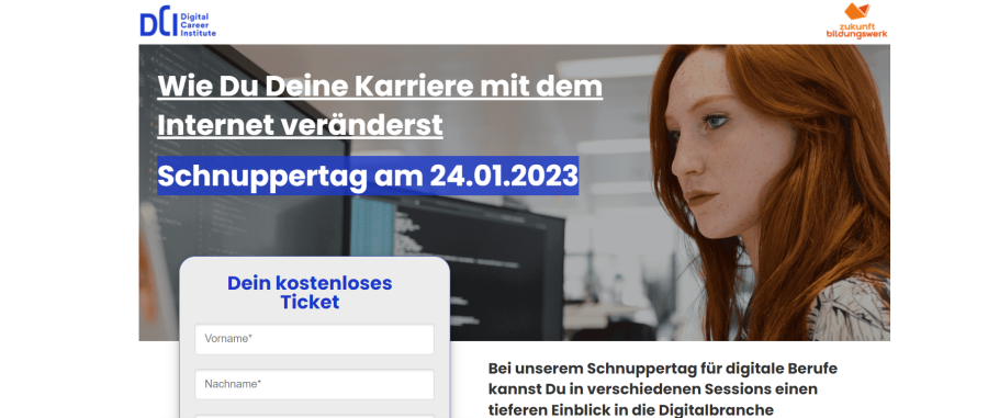 Lerne neue digitale Berufe im Online Marketing, Social Media, Sales Force, Programmieren uvm. kennen und starte deine berufliche Karriere mit uns gemeinsam. Am 24. Januar 2023 laden wir mit dem DCI von 09-13 Uhr zu einer Veranstaltung rund um digitale Berufe und Weiterbildungen ein. Der Anmeldelink folgt: https://start.digitalcareerinstitute.org/de/schnuppertag-fur-digitale-berufe/