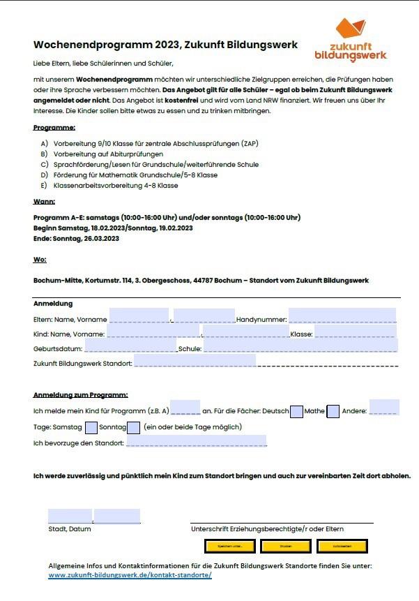 Unser Wochenendprogramm startet ab dem 18. Februar 2023. Das Programm findet samstags und sonntags vom 18.02.2023 bis zum 26.03.2023 statt und ist für alle SchülerInnen kostenfrei. Das Angebot richtet sich vor allem an SchülerInnen der Abschlussklassen und bei denen eine Versetzung gefährdet ist. Außerdem richtet sich unser Programm an alle Lernende, die ihre Deutschkenntnisse verbessern wollen. Meldet Euch bei uns bis vorzugsweise zum 14.02.2023.